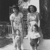 At Mountain Street house, probably 1948. Who's sitting in the car? Note wooden high chair by Dot's shoulder and in front of tree...it's in my basement.