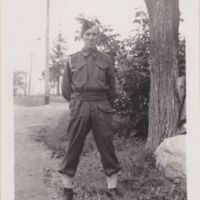 Looks like his parents yard at the lake. In the background is a railroad crossing sign at Main Street. Probably 1940 during reserve training when all 21 year olds were called up for 3-month training.