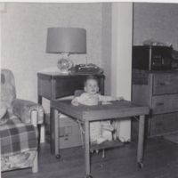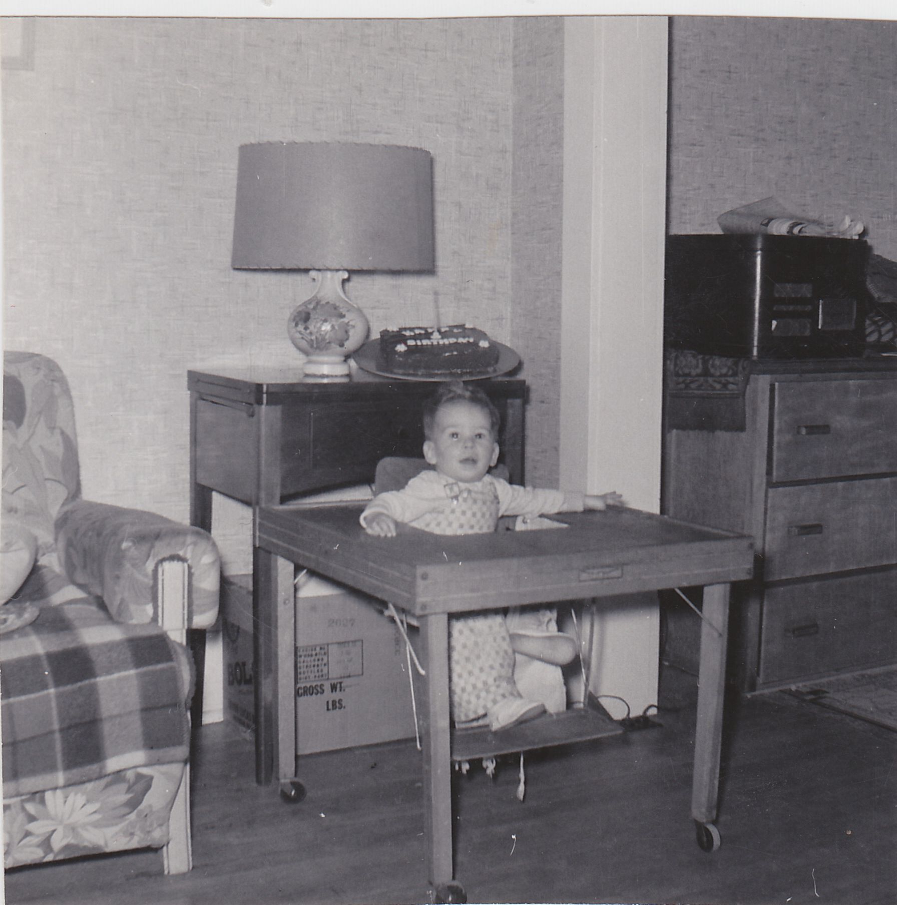 Maybe Jake's first birthday? There's a birthday cake above his head sitting on the sewing machine. December 1957?
