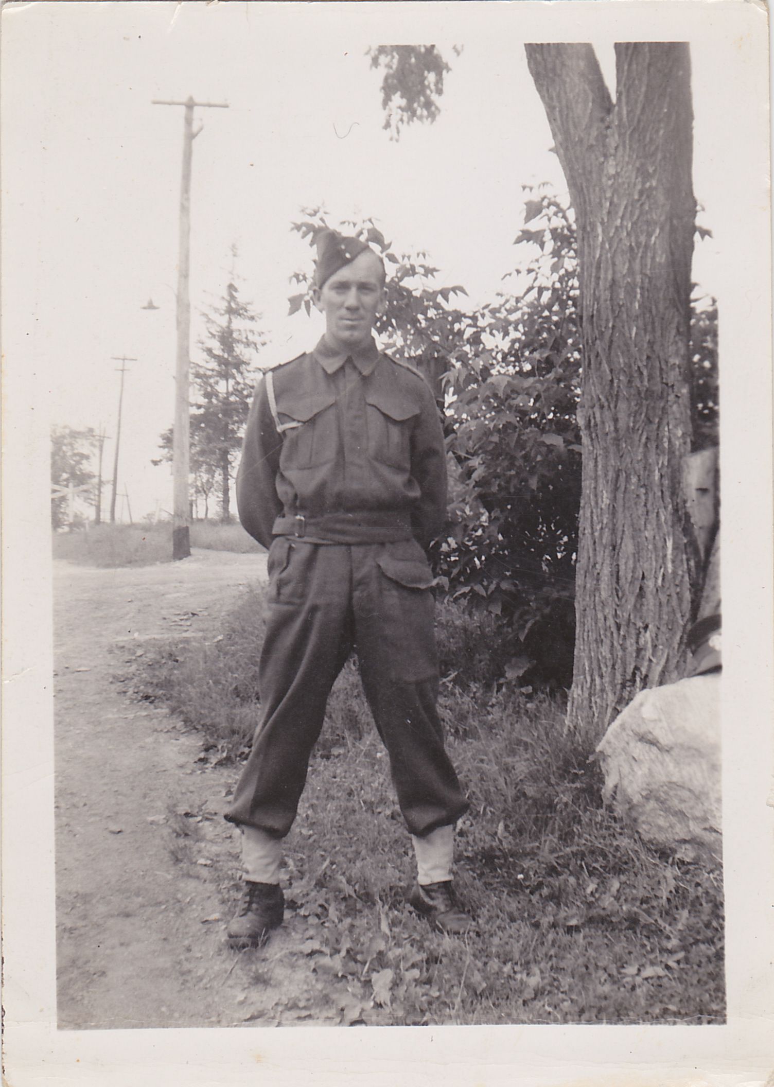 Looks like his parents yard at the lake. In the background is a railroad crossing sign at Main Street. Probably 1940 during reserve training when all 21 year olds were called up for 3-month training.