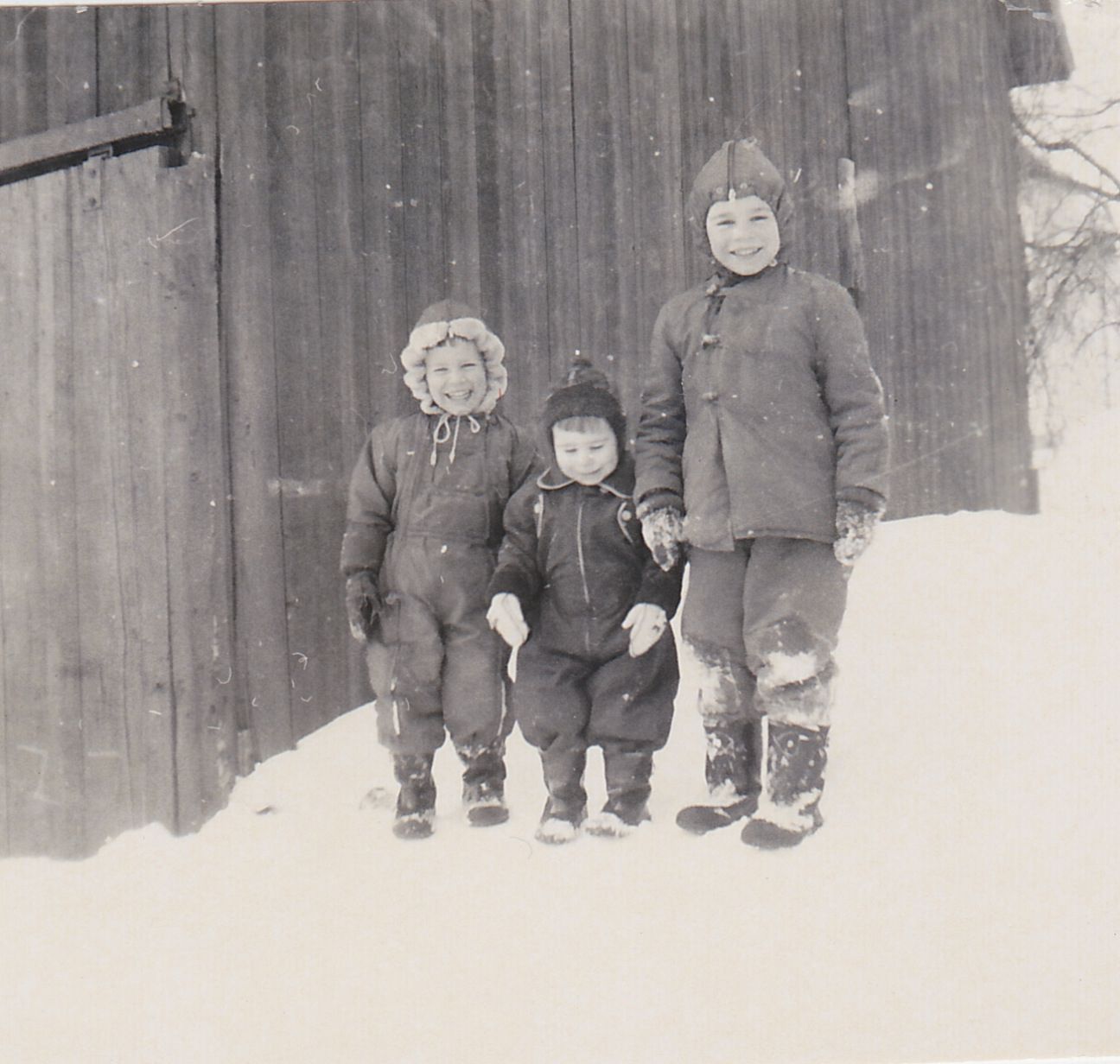 On a snowbank beside the original two-storey barn at Brook and Broad. This snowbank would have been on the sidewalk! Very few pictures of the barn appear to exist; the right wall faces Broad Street, the wooden sliding door on metal hanger was one of two garage sized doors.