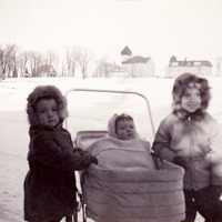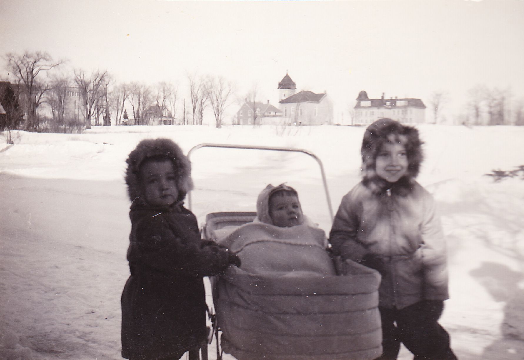 Brian wrote "The picture with Marc, Wayne and myself with Marc in the carriage amazing not for the three of us but for the background. The way things were with Mountain Street probably ending at Peach's house about 100 yards to the right, probably street car tracks buried in the snow behind us, and the clear view up to the school and the United Church. This reminds of the morning that Wayne and I awoke cheering to see smoke billowing from the old Academy. The fun was short lived when Mom made it clear that it was no laughing matter. We did get a couple of days off however!