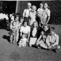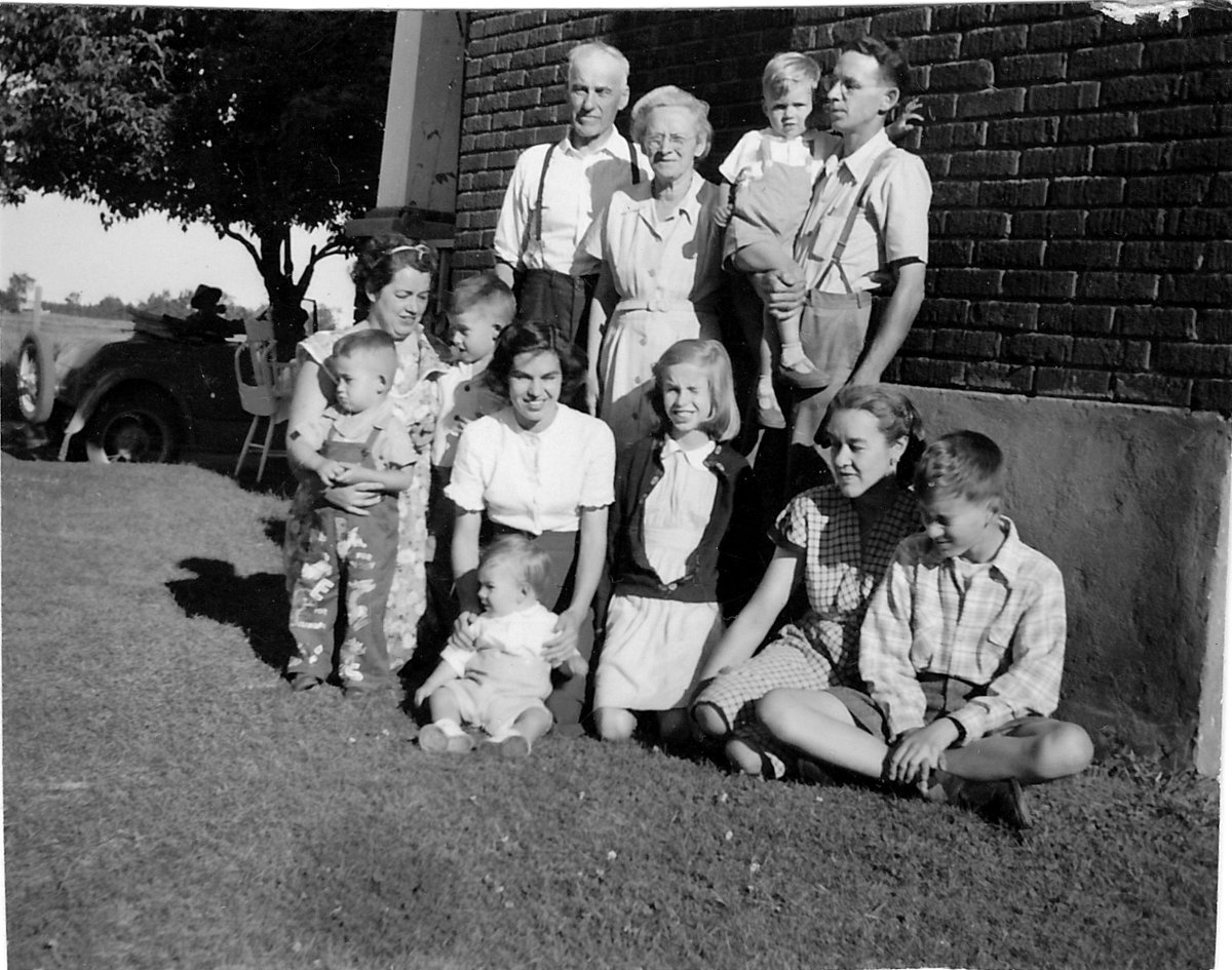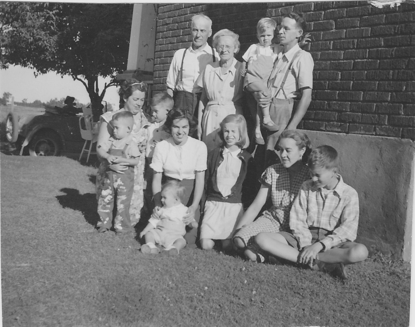 At Mountain Street house, probably 1948. Who's sitting in the car? Note wooden high chair by Dot's shoulder and in front of tree...it's in my basement.