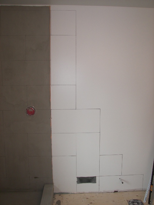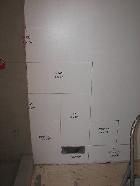 The tiles...darkest (top), two mediums laid 90 degrees to each other and the lightest in foreground.